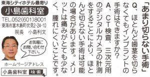「あまり切らない手術」東海タイムズ2021年4・5月合併号掲載 2021年5月31日 Q.ほとんど歯茎を切らなくてもインプラントの手術はできますか? A.CT検査、三次元用のデジタルカメラの計測をすることにより、ほとんど切らない手術は可能の場合があります。 メリットは痛みがとても少なく、腫れにくいことです。 < 次の記事 │