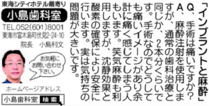 「インプラントと麻酔」東海タイムズ2021年6・7月合併号掲載 2021年6月22日 Q.手術は痛いですか? A.麻酔注射を使用しますが、通常の歯科治療と同じか、2本くらいです。 手術なのでどうしても痛いイメージがあり余計に痛く感じてしまう人もいます。 笑気麻酔も利用しますが、鎮静効果と酸素の確保により安全に行います。 実は気持ちの問題が大きいです。 < 次の記事 │ 前の記事 >