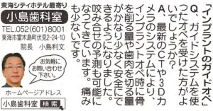 「インプラントのガイドオペ」東海タイムズ2022年4月号掲載 2022年4月30日 Q.ガイドシステムを使ったオペを受けたほうがよいでしょうか? A.最新のCTや3Dカメラのシステムにより、インプラントオペ時に骨を削る量や歯肉を切る量がかなり少なく安全にできるようになりました。 咬み合わせの予測も可能になってきています。 痛みも少ないです。 < 次の記事 │ 前の記事 >