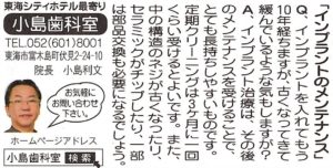 「インプラントのメンテナンス」東海タイムズ2021年8・9月合併号掲載 2021年8月24日 Q.インプラントを入れてもう10年経ちますが、古くなってきて緩んでいるような気もしますが? A.インプラント治療は、その後のメンテナンスを受けることで、とても長持ちしやすいものです。 定期クリーニングは3ヶ月に一回くらい受けるとよいです。 また、中の構造のネジが古くなったり、セラミックがチップしたり、一部は部品交換も必要になるでしょう。 < 次の記事 │ 前の記事 >