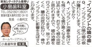 「インプラントの隣の歯」東海タイムズ2021年10月号掲載 2021年10月26日 Q.インプラントの隣の歯の根が腫れたりします。 どうしたらよいですか? A.インプラント治療を受けても残っている歯が悪くなることはあります。 おそらく根の炎症と思われますので、歯の治療を行うことになります。 放っておくと、膿の炎症が拡がり、骨やインプラントに影響を及ぼすことがあります。 < 次の記事 │ 前の記事 >