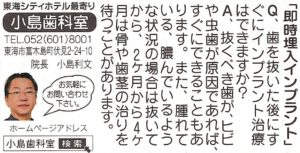 「即時埋入インプラント」東海タイムズ2022年7・8月合併号掲載 2022年7月27日 Q.歯を抜いた後にすぐにインプラント治療できますか? A.抜くべき歯が、ヒビや虫歯が原因であれば、すぐにできることもあります。 また、腫れている、膿んでいるような状況の場合は抜いてから、2ヶ月から4ヶ月は骨や歯茎の治りを待つことがあります。 < 次の記事 │ 前の記事 >