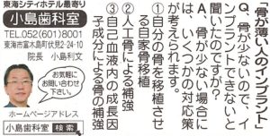 「骨が薄い人のインプラント」東海タイムズ令和4年10月号掲載 2022年11月1日 Q. 骨が少ないので、インプラントできないと聞いたのですが? A. 骨が少ない場合には、いくつかの対応策が考えられます。 ①自分の骨を移植させる自家骨移植 ②人工骨による補強 ③自己血液内の成長因子成分による骨の補強 │ 前の記事 >